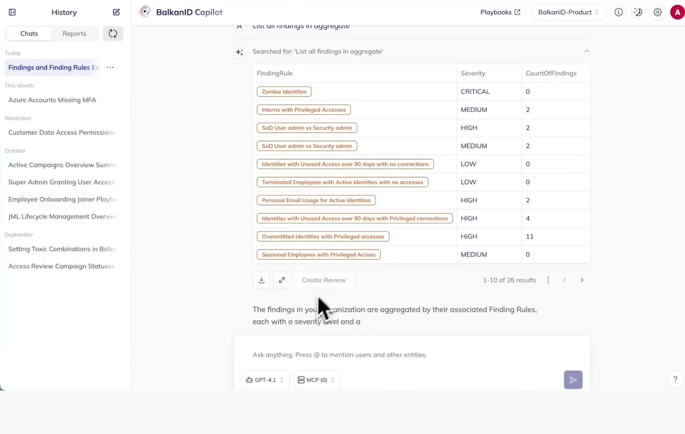 Generate, analyse, and complete access reviews automatically. AI surfaces what needs attention and recommends decisions.